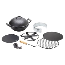 • Grill. Wok. Rök. Stekpanna. Gryta. Fritös. Långkok. Kastrull. All-In-One Cast Iron Grill är drömmen för alla som älskar att laga mat utomhus. Tack vare sin smarta, modulära design kan du grilla, steka, baka, röka eller långkoka – allt med en enda produkt.