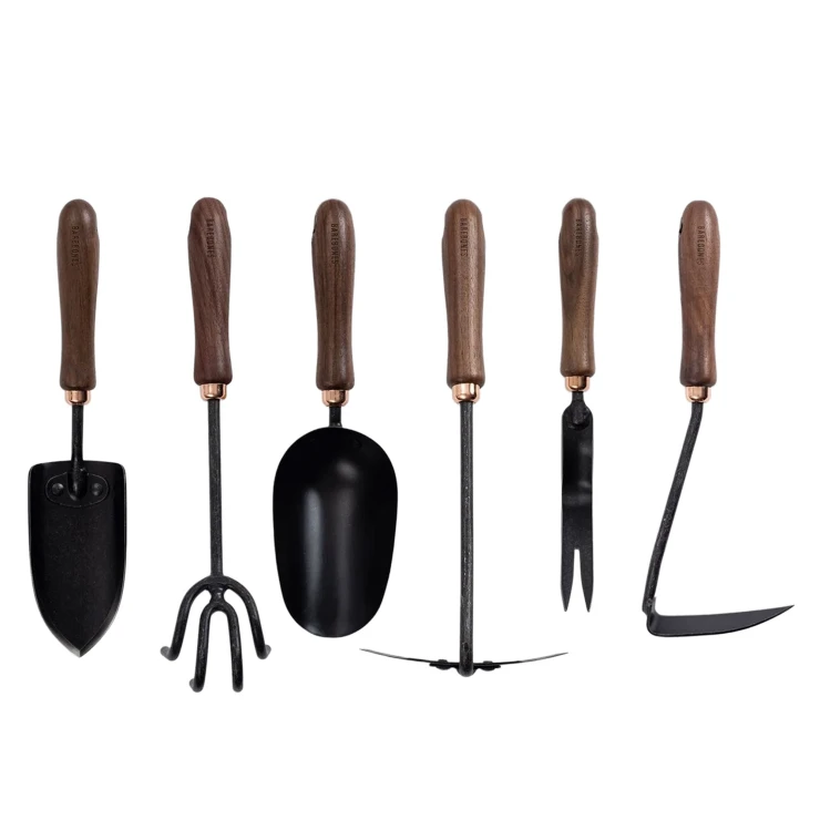 • Barebones Set – ett komplett set med sex noggrant utvalda trädgårdsredskap, designade för att kombinera funktion, komfort och tidlös stil. Varje verktyg är tillverkat i rostbeständigt, värmebehandlat stål med eleganta koppardetaljer och ergonomiska trähandtag – byggda för att hålla livet ut. Välj mellan två utföranden: valnöt & svartoxiderat stål för en naturlig känsla, eller ask & mintfärgad emalj för en mer livfull och modern look som verkligen sticker ut i trädgården.