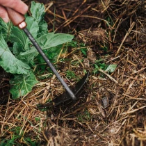 • Ett mångsidigt trädgårdsverktyg för både nybörjare och erfarna odlare. Med sin spetsiga form är hackan perfekt för att plantera frön och lökar, hugga bort tätt ogräs eller för att luckra jorden kring odlingarna. Ett oumbärligt redskap för effektiv plantering, rensning och kultivering.