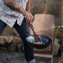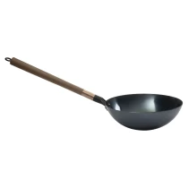 • Inspirerad av den traditionella woken utökar vår Long Handle Wok dina matlagningsmöjligheter, oavsett om du lagar mat i köket eller under öppen himmel. Den robusta skålen i valsat stål (ø 30 cm) har en handblånad yta som skyddar mot rost och korrosion över tid. Med sitt extra långa handtag i hållbar valnöt (46 cm) erbjuder den både komfort och säkerhet vid matlagning över öppen eld.