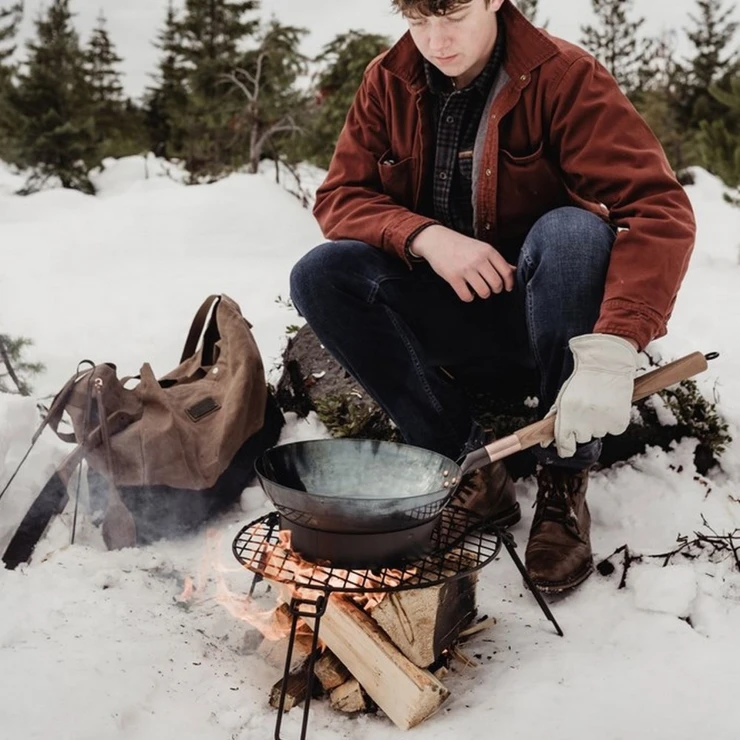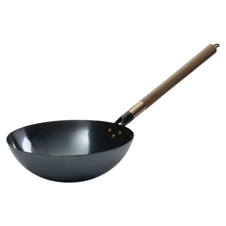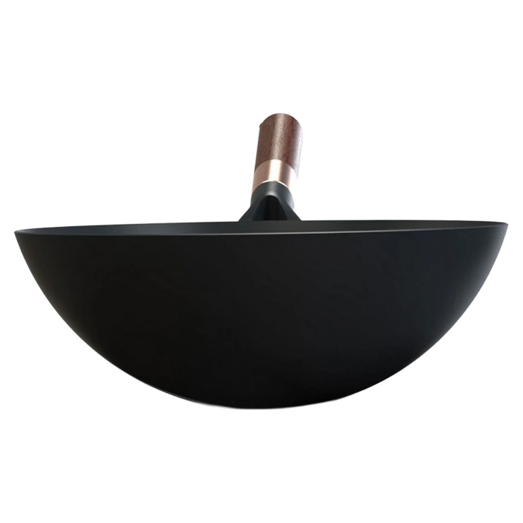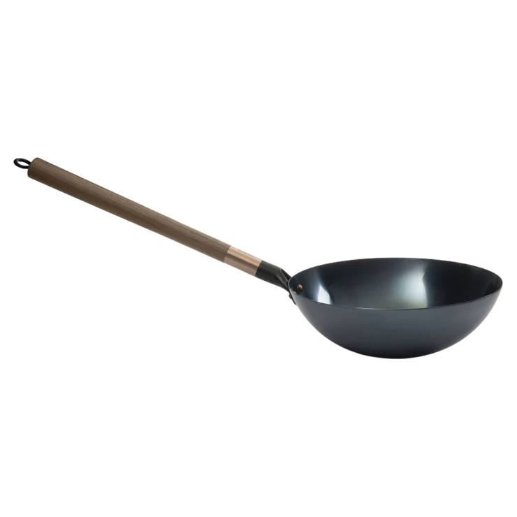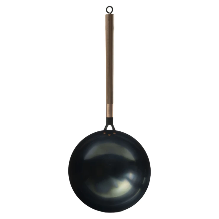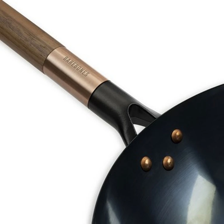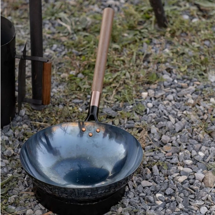 • En noggrant placerad ring i rostfritt stål med kopparfinish skyddar trähandtaget från lågor samtidigt som den tillför en elegant detalj. Den handblånade stålringen i basen gör det möjligt att ställa ner woken i en idealisk position utan att behöva hålla i handtaget hela tiden. Den kan användas direkt på gasspis, kol eller vedeld, eller som en stående grill för snabb matlagning på språng. En mångsidig och resevänlig kompanjon för både camping och kök.