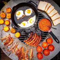 BonBiza är särskilt speciell eftersom du inte bara kan njuta av en mysig eld utan också tillaga läckra måltider på den med planchan. Planchan har en diameter på 80 cm, är 6 mm tjock och fungerar utmärkt som stek- och bakyta. Tack vare den stora storleken kan du tillaga flera olika rätter samtidigt, och värmen sprids gradvis från mitten till kanterna, vilket gör planchan mångsidig och idealisk för olika typer av matlagning. Konstruktionen är robust och anpassad för långvarig användning utomhus, oavsett säsong.