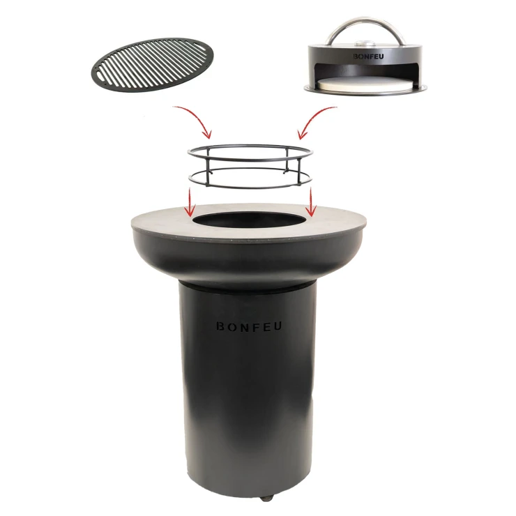 BonFeu Set med BonBiza Eldstad Svart, Subbel Stålring för Gril, Grillgaller Rund & Pizzaugn