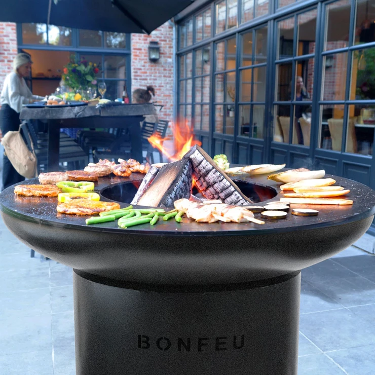 BonBiza är mer än en traditionell grill – det är ett komplett utomhuskök designat för både grillning och plancha-matlagning. Tillverkad i slitstarkt kolstål med elegant svart finish kombinerar den funktion, stil och hållbarhet i ett. Med sin generösa matlagningsyta på Ø80 cm är BonBiza perfekt för att tillaga hela måltider för upp till åtta personer.