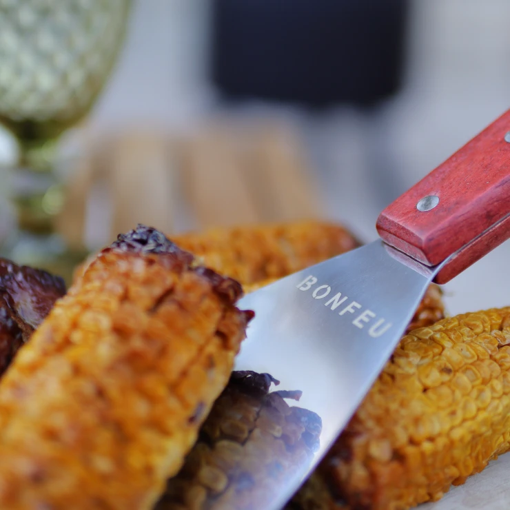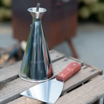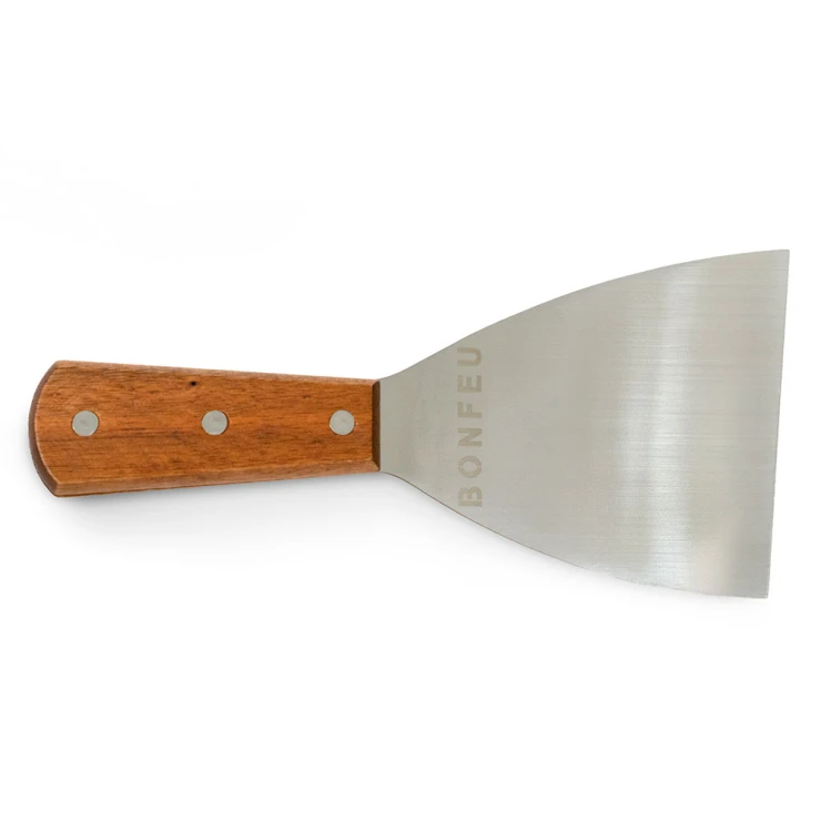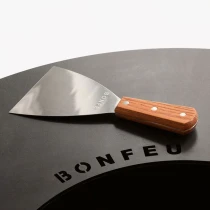 BonFeu Stekspade är ett oumbärligt redskap för plancha- och grillmatlagning. Den är tillverkad av slitstarkt rostfritt stål med ett ergonomiskt trähandtag som ger bekvämt grepp även vid hög värme. Den breda bladytan gör den perfekt för att vända kött, fisk och grönsaker eller för att skrapa bort matrester från planchan. Den graverade BonFeu-logotypen på handtaget ger ett elegant och professionellt intryck. Lätt att rengöra och byggd för långvarig användning utomhus.