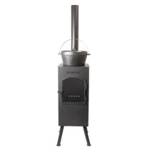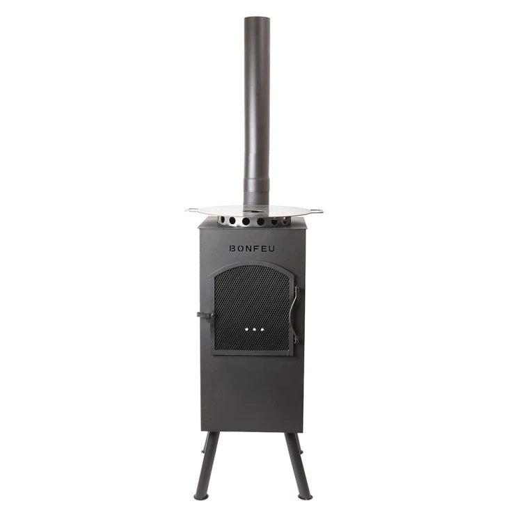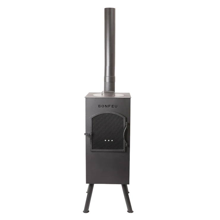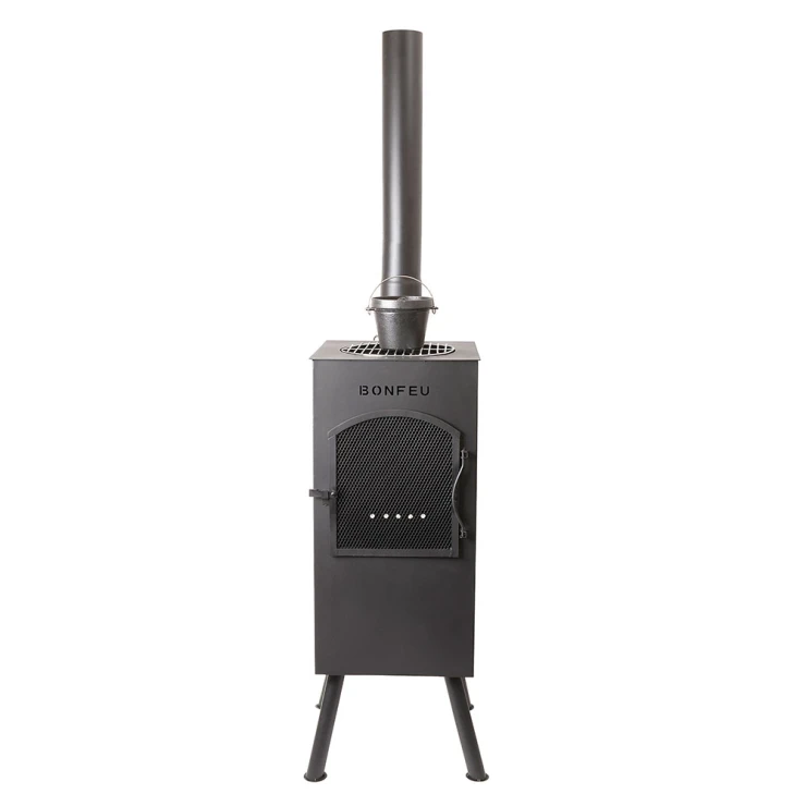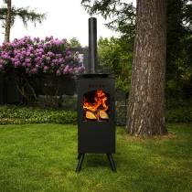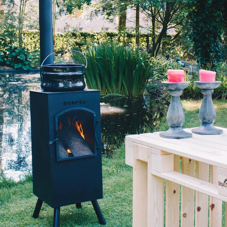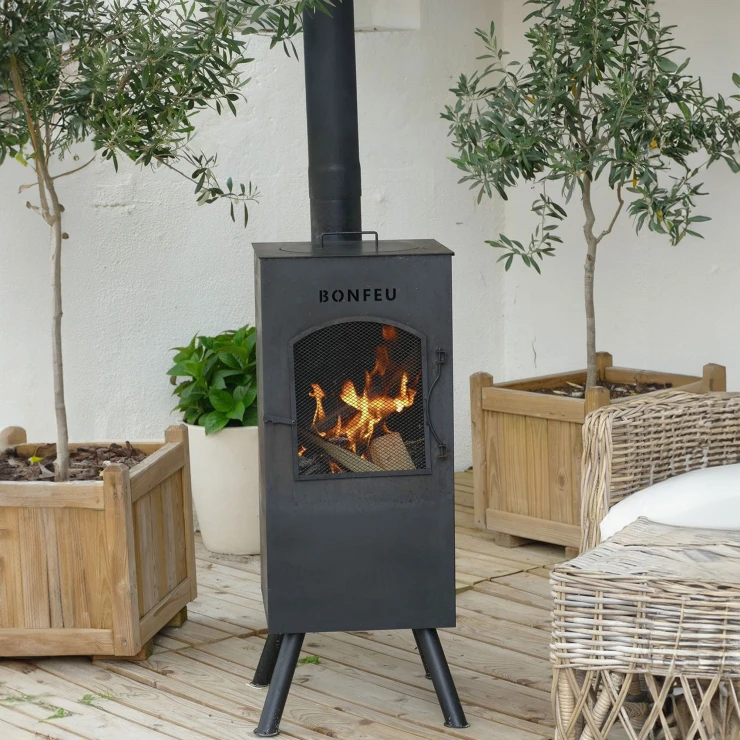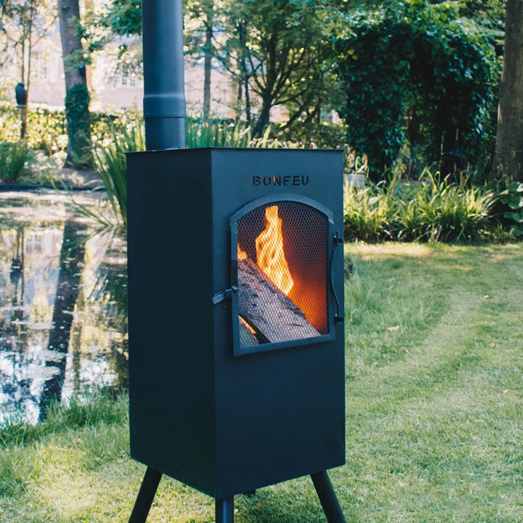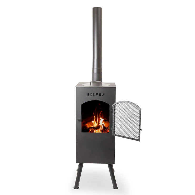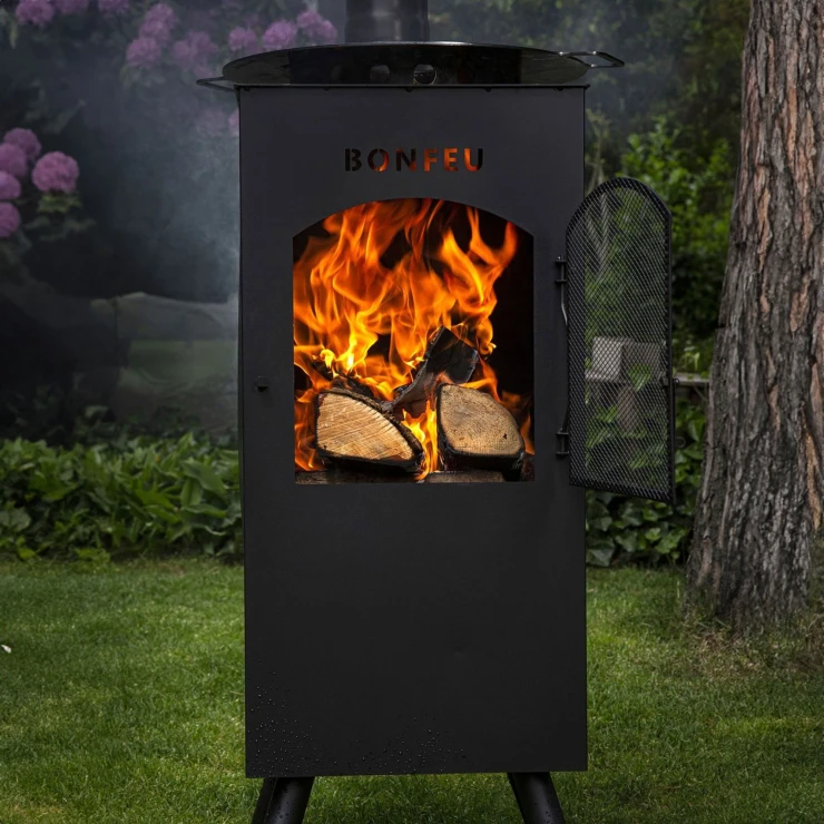 BonFeu BonCarré är en robust och mångsidig eldstad tillverkad av högkvalitativt kolstål med svart värmetålig beläggning. Den fyrkantiga formen med fyra ben ger stabilitet och ett tidlöst uttryck, medan den höga skorstenen effektivt leder bort röken. Framsidan är utrustad med ett avtagbart gnistskydd som förhindrar att ved och gnistor faller ut, vilket ger både trygghet och komfort.
