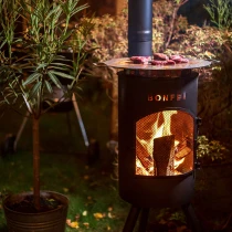 BonFeu BonGiano SP i svart är en stilren och multifunktionell utomhuseldstad som både sprider värme och fungerar som grill. Den runda designen med skorsten ger effektiv rökavledning, medan dörren med gnistskydd ser till att veden hålls säkert på plats och att gnistor minimeras. Tack vare sin robusta konstruktion och stabila bas är den lika funktionell som dekorativ.