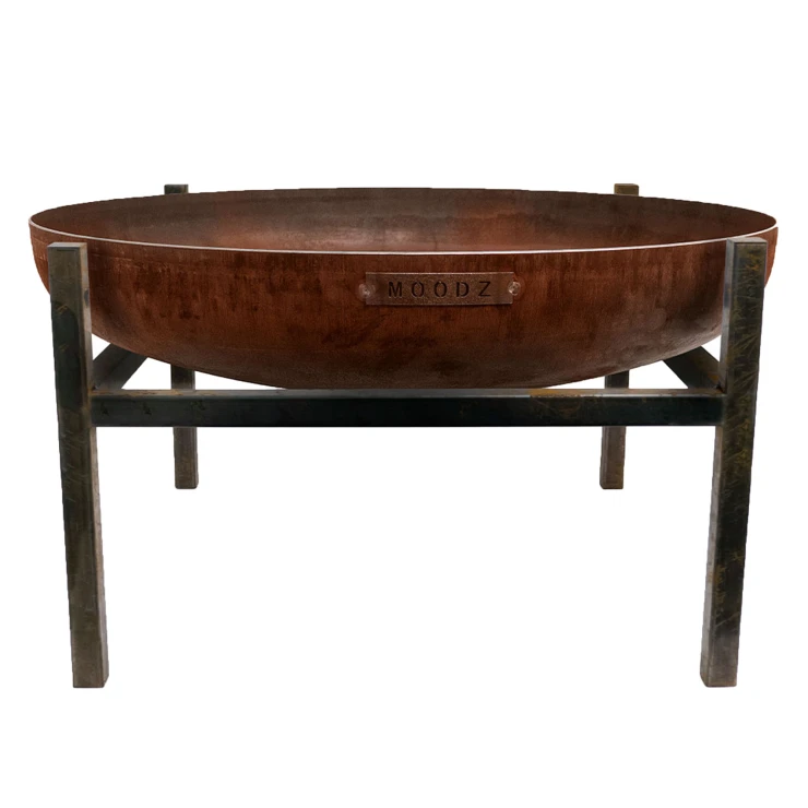 Den stora eldskålen från MOODZ är tillverkad i 3 mm tjockt cortenstål – ett material som utvecklar en varm, rostbrun yta med tiden. Den naturliga patinan skyddar stålet och gör att skålen kan stå utomhus året runt utan behov av målning eller underhåll. Med sin generösa diameter på 100 cm blir den en elegant mittpunkt som bjuder in till stämningsfulla kvällar och sociala stunder i trädgården.