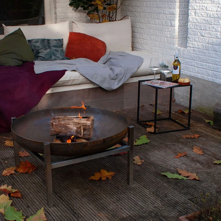 • Detta exklusiva utomhusset kombinerar MOODZ eldskål i cortenstål med ett robust, rektangulärt stativ i stål som skyddar underlaget mot värme. En perfekt lösning för trädgården, terrassen eller uteplatsen där design och funktion möts.