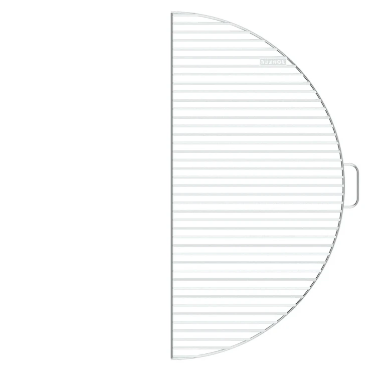 Det halvrunda grillgallret i stål gör eldstaden komplett för klassisk utomhusgrillning. Placera gallret på eldstadens kant för att grilla kött, fisk eller grönsaker direkt över öppen låga, samtidigt som den andra halvan av skålen kan användas för ved eller värme. Den öppna designen ger optimal luftcirkulation och jämn värmefördelning, medan det integrerade handtaget gör det lätt att hantera och rengöra. Perfekt för dig som vill kombinera matlagning och mysig eld i ett.