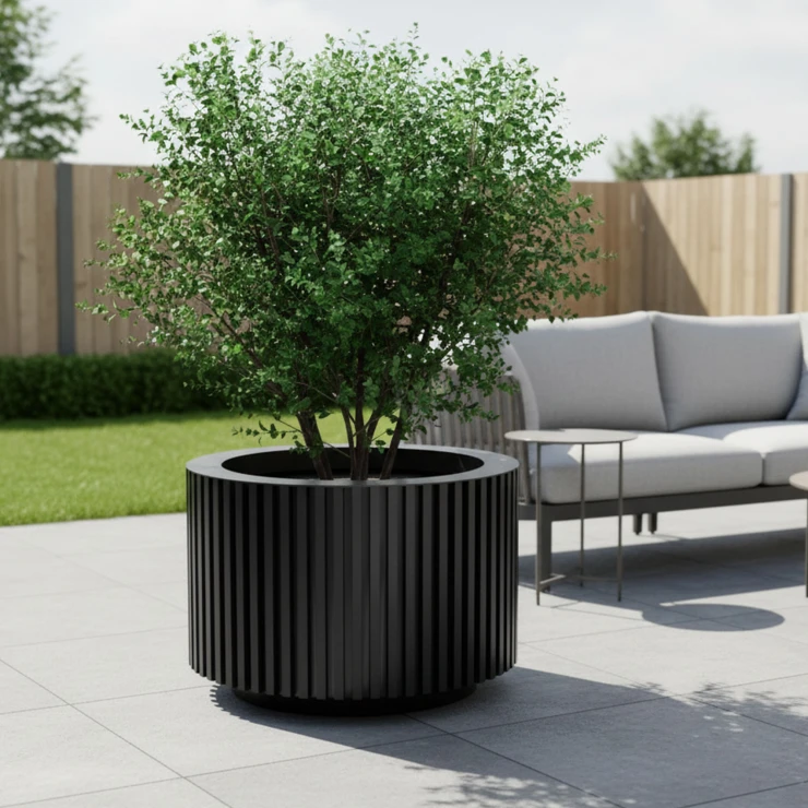 • Den dekorativa designen med vertikala ribbor förstärker krukans arkitektoniska uttryck och skapar ett spel av skuggor som ger ett exklusivt intryck. Ytan pulverlackeras i flera lager för att ge en väderbeständig, UV-resistent finish som motstår repor, blekning och hårda klimatförhållanden. Haverhill tillverkas i små serier med fokus på precision, materialkvalitet och äkta hantverk – något som gör kollektionen efterfrågad i både privata och offentliga premiumprojekt.